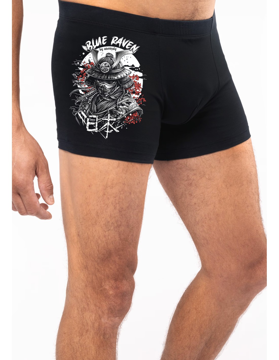 Boxer Noir Blue Raven By Anomaly orné d'un samouraï et du logo Blue Raven By Anomaly sur le côté opposé.