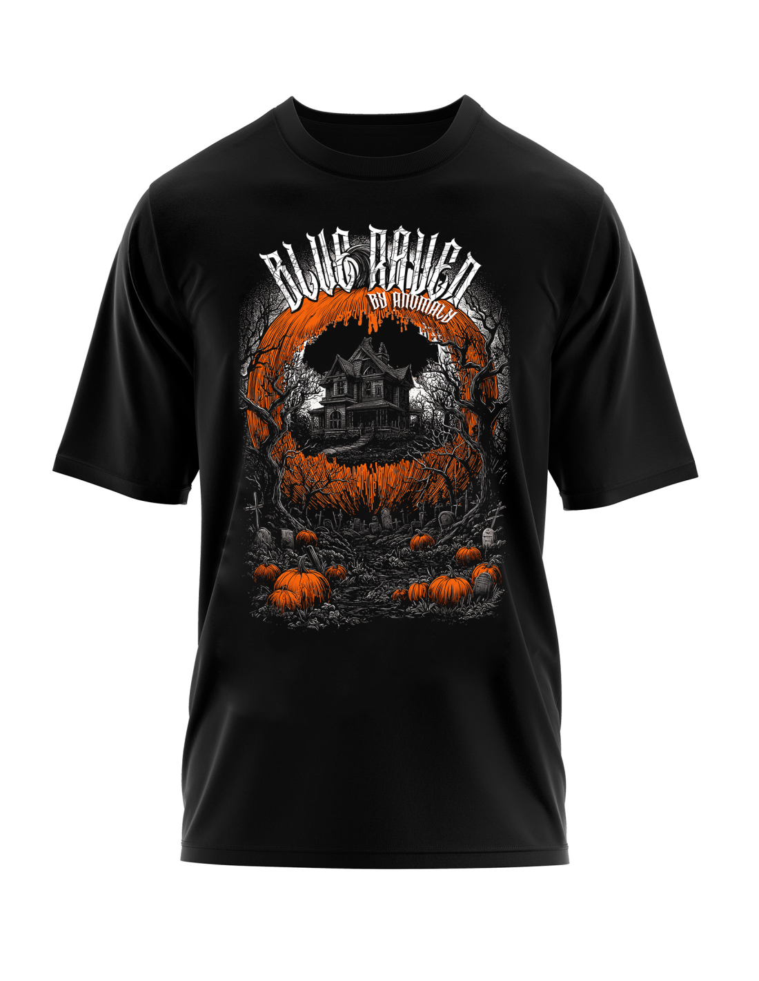 Vous allez adorer ce T-shirt homme orné d'un manoir hanté entouré de citrouilles, idéal pour Halloween !